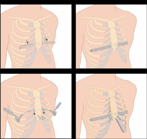 El cirujano inserta una barra de acero que se ha curvado para encajar debajo del esternón cóncavo y alrededor de la parte frontal del pecho. La barra ayuda a remodelar el pecho a medida que el niño crece.