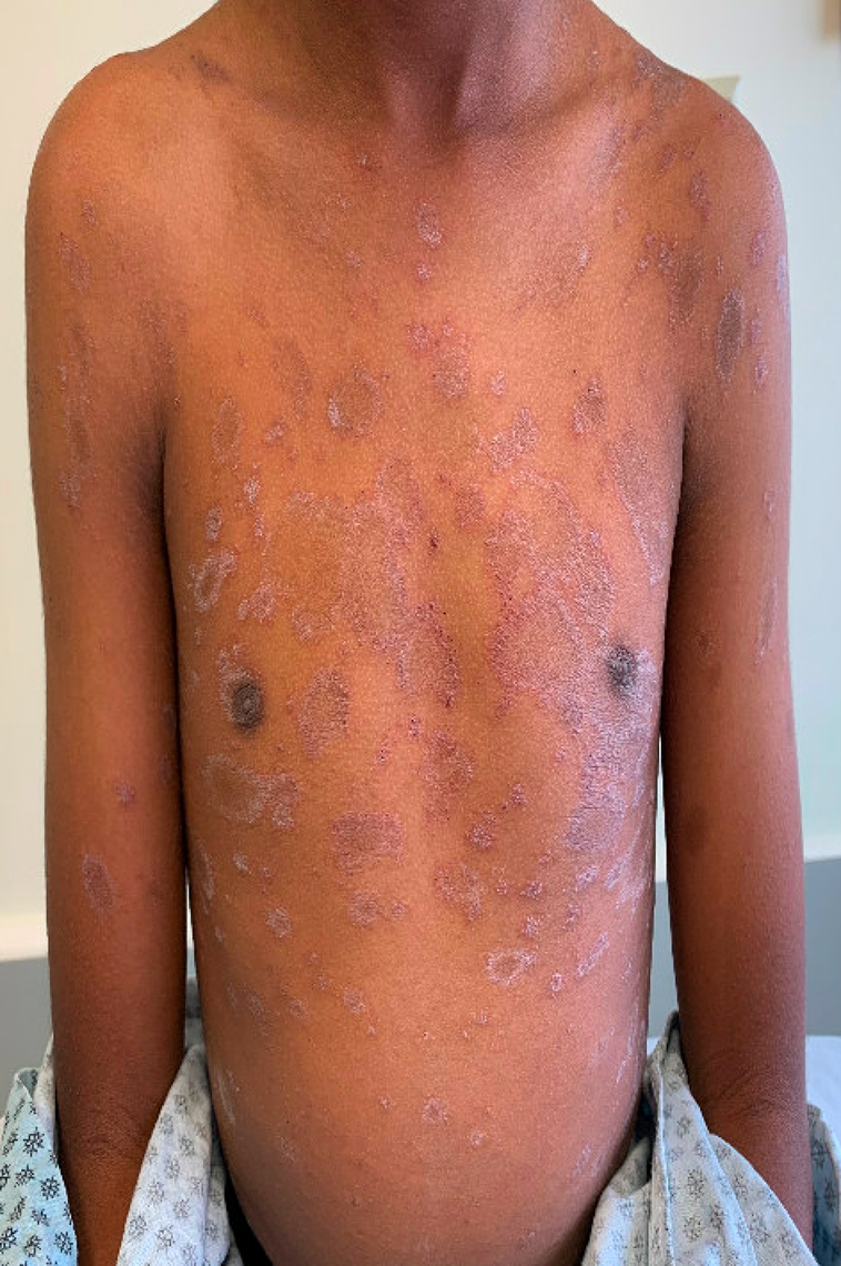 Approximately four weeks prior to presentation, his parents noticed a scaly patch on the chest. Over the following one to two weeks, additional similar lesions developed and spread across the chest and back. The rash has been mildly itchy but not painful, and it has not interfered with sleep or daily activities. There have been no associated systemic symptoms, including fever, sore throat, cough or malaise. He has not had any recent medication changes, new personal care products or known exposures. No one else at home has a similar rash.