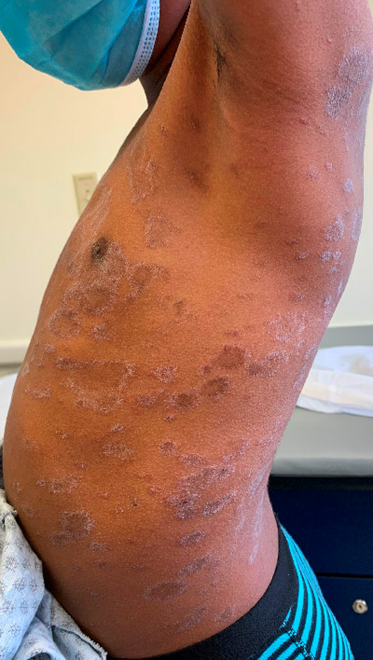 The patient was seen for follow-up a month after his initial visit with significant improvement in the eruption with some residual post inflammatory dyspigmentation.