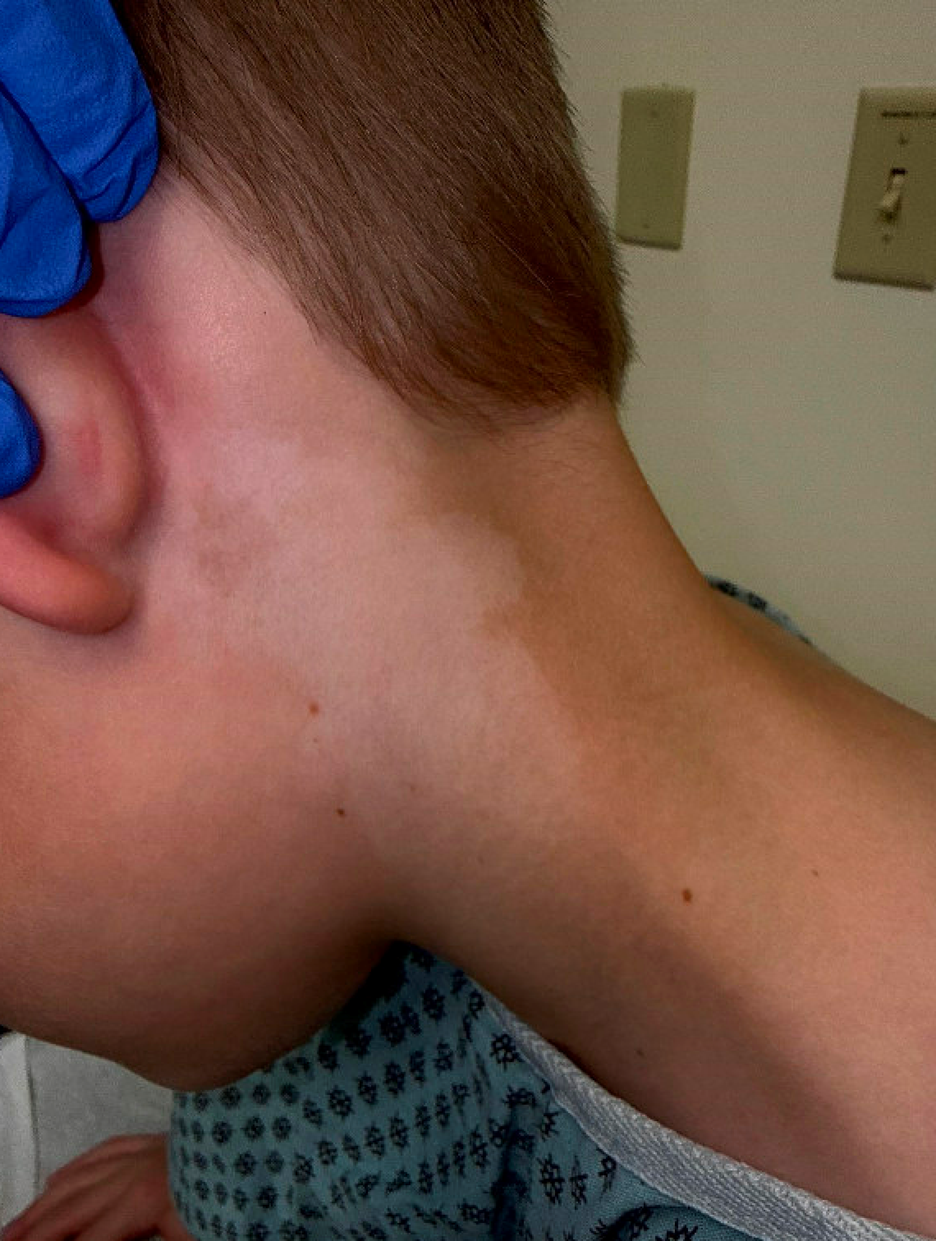 A 6-year-old boy presents for evaluation of light-colored patches on the skin. Approximately one year ago, his parents noticed a lighter patch on the left side of his neck as well as a similar area behind his knee. The lesion behind the knee has since resolved, but the patch on the left neck has persisted. The lesion has remained stable in size since it was first noticed.