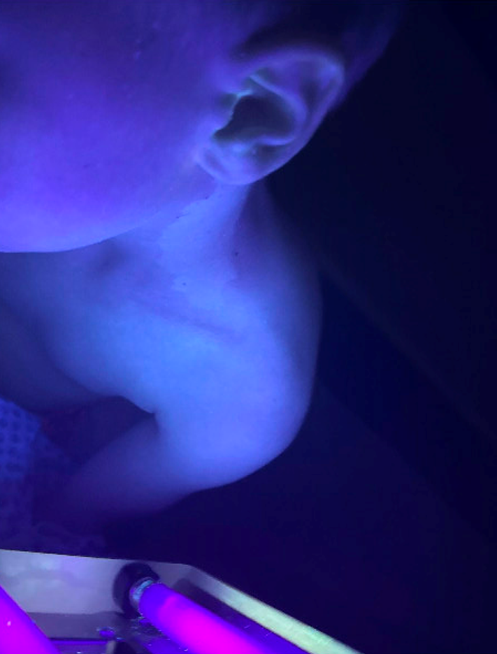 On physical examination, there is a well-demarcated depigmented patch on the left lateral neck without scale or textural change. Examination under Wood’s lamp reveals bright blue-white fluorescence with sharp borders corresponding to the lesion. These findings are in keeping with acquired areas of depigmentation consistent with vitiligo. Vitiligo is an acquired disorder characterized by complete depigmentation resulting from autoimmune destruction of melanocytes. Lesions are typically well demarcated and accentuate under Wood’s lamp examination, showing bright blue-white fluorescence with sharp borders. When it occurs on hair-bearing skin, it may be associated with depigmentation of the hair, known as poliosis. Vitiligo has a variable and unpredictable natural history, particularly in children. Some patients experience slow progression or stability, while others may develop additional lesions over time. Spontaneous repigmentation can occur, especially in children and in sun-exposed areas, but is often incomplete. Early intervention may improve cosmetic outcomes and promote repigmentation, particularly in localized disease. Importantly, vitiligo is a benign, noncontagious condition and does not affect overall physical health, though it may have significant psychosocial impact.